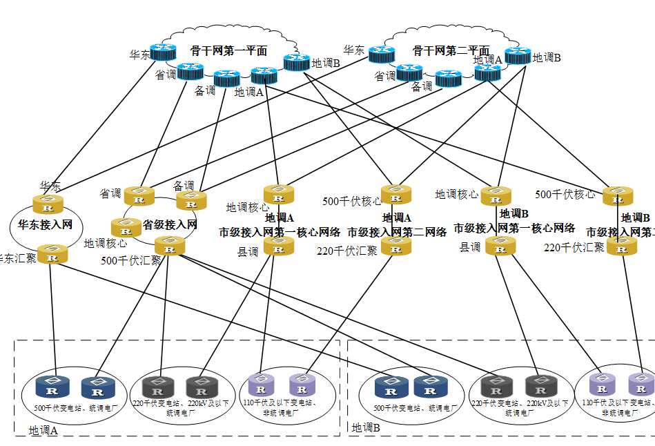 公司的電力調(diào)度數(shù)據(jù)集成方案采用省、市、縣三級(jí)結(jié)構(gòu)和雙平面部署,并分為調(diào)度主站和變電站子站建設(shè)。其中,路由交換設(shè)備負(fù)責(zé)匯聚、分發(fā)和管理數(shù)據(jù);防火墻、縱向加密、橫向隔離等設(shè)備保障網(wǎng)絡(luò)邊界安全;網(wǎng)絡(luò)安全監(jiān)測(cè)裝置、入侵檢測(cè)、防惡意代碼等設(shè)備保障內(nèi)部數(shù)據(jù)安全。
